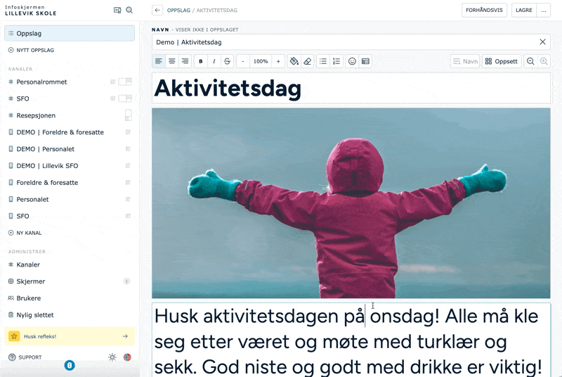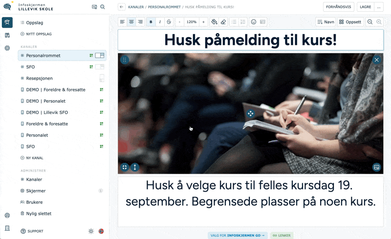 Pushvarslinger gjør det mulig å sende ut et varsel til brukere av Infoskjermen Go-appen om at det er publisert noe nytt på skjermen. En perfekt måte å dele informasjon med de som ikke befinner seg ved den fysiske infoskjermen! 📱💬