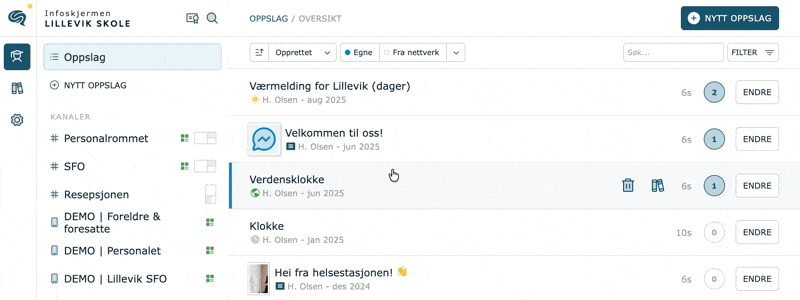 ❌ Trykk på dette for å fjerne oppslaget fra kanalen. Oppslag som fjernes fra en kanal, finner du fortsatt i listen under menyvalg Oppslag.