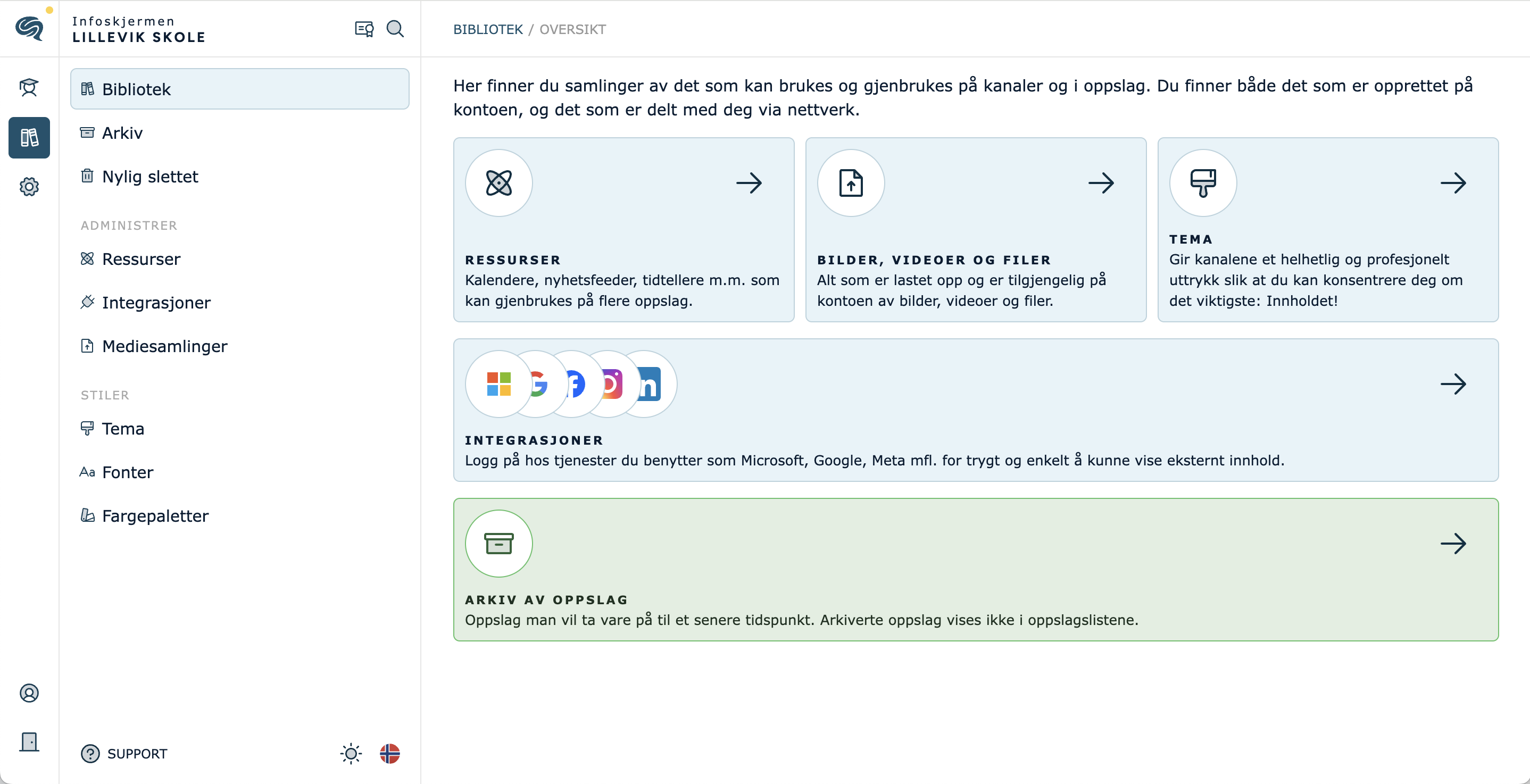 ℹ️ I Biblioteket (📚-ikon i venstre sidestolpe) på Infoskjermen-kontoen finner du, og kan lage samlinger av media, integrasjoner og ressurser som kan brukes og gjenbrukes på kanaler og i oppslag. Du finner både det som er opplastet og opprettet på kontoen, og det som er delt med kontoen via nettverk.