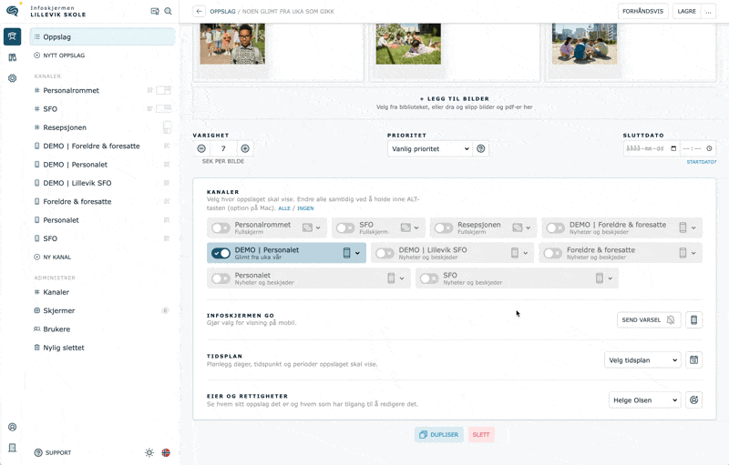 Lenger ned, ved "Tidsplan" velg ett av hurtigvalgene for tidsplan, eller klikk kalenderikonet 📆 for å planlegge dager i uken, tidspunkt og/eller perioder for når oppslaget skal vises. Du kan legge til en eller flere perioder, definert med dato og klokkeslett. Du kan også legge inn dager og klokkeslett oppslaget skal vises, f.eks. kan du velge å vise et oppslag hver morgen i ukedagene.